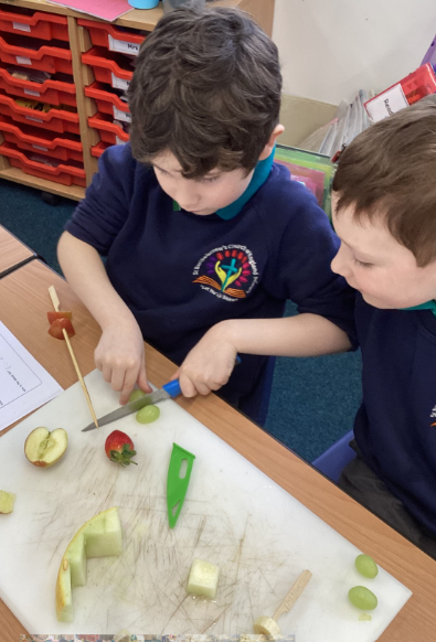 In Design and Technology, the children had a fantastic time designing, making, and evaluating their own fruit kebabs. They loved the process, were so proud of their creations, and learned all about food hygiene and safe preparation techniques. It was wonderful to see them tasting their own creations and sharing their successes with each other.