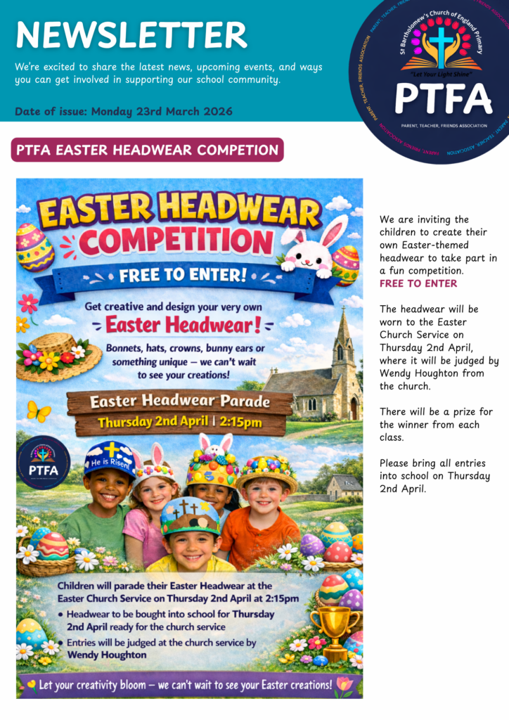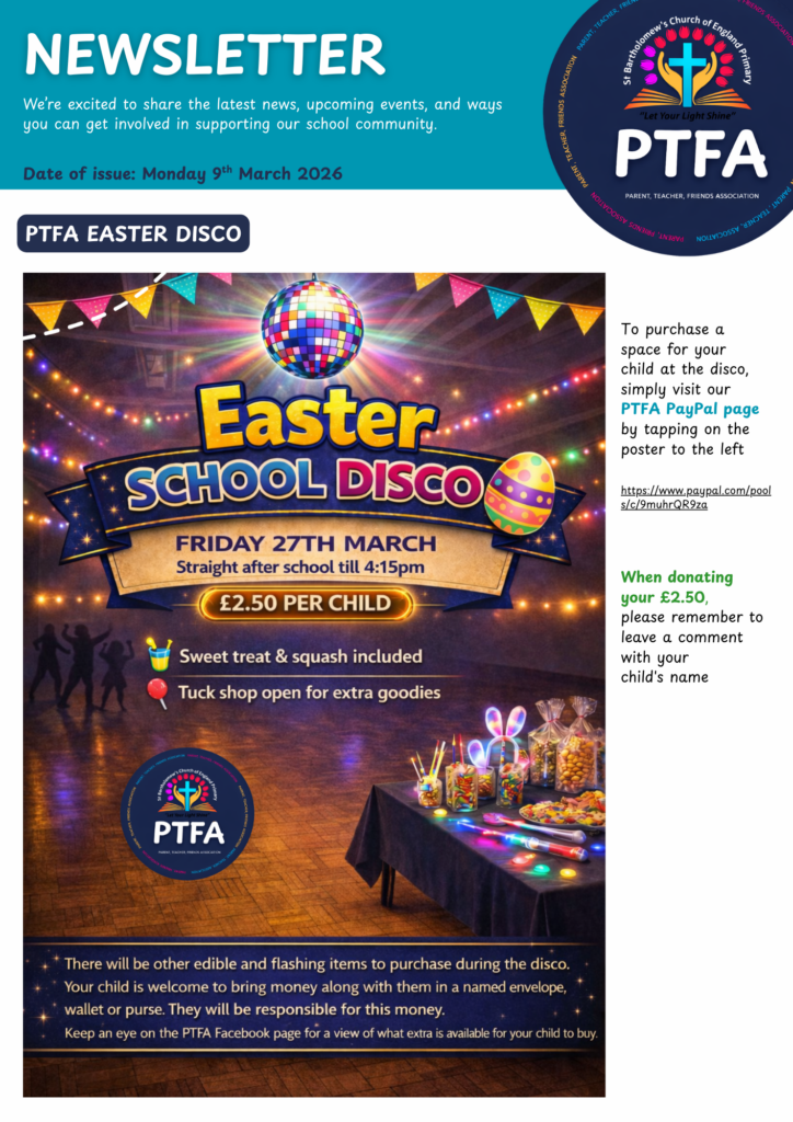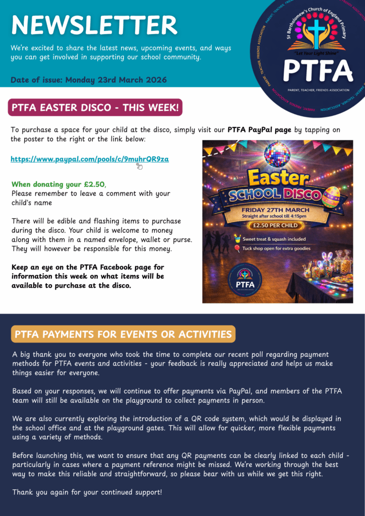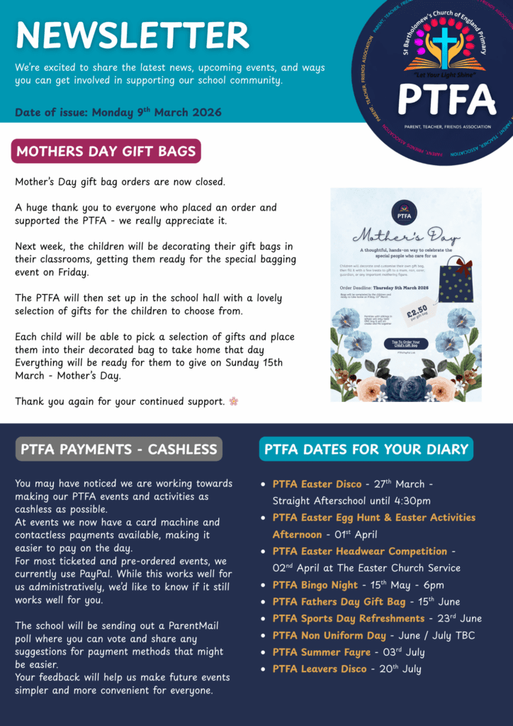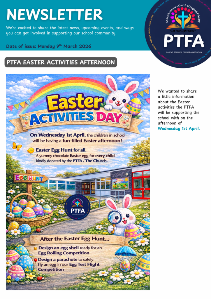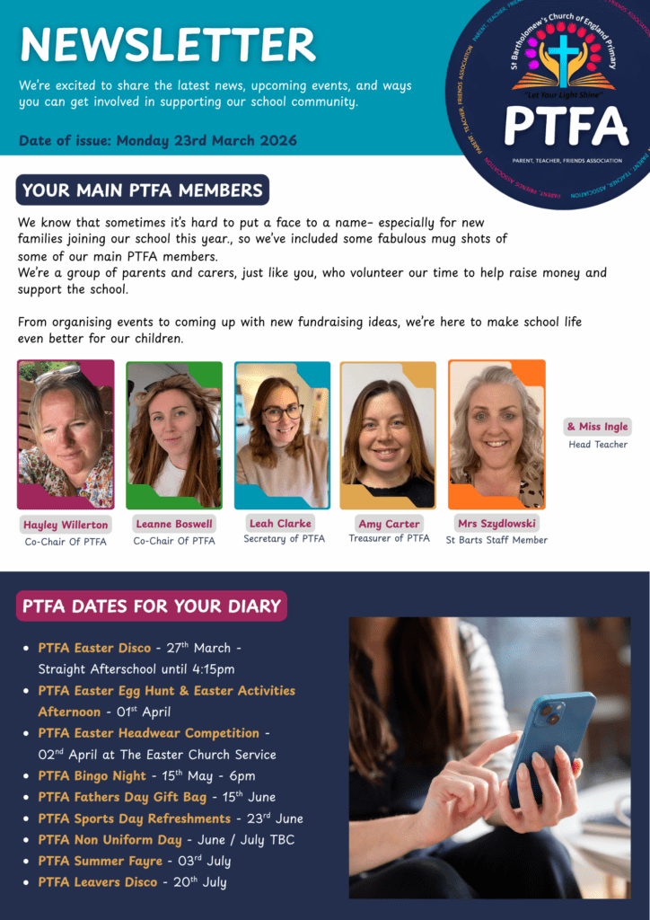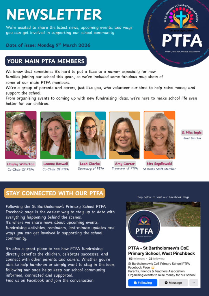 St Bartholomew’s has an extremely supportive Parents, Teachers and Friends Association, which works tirelessly to raise funds for the children. If you would like to find out more about the PTFA, please contact the school office.