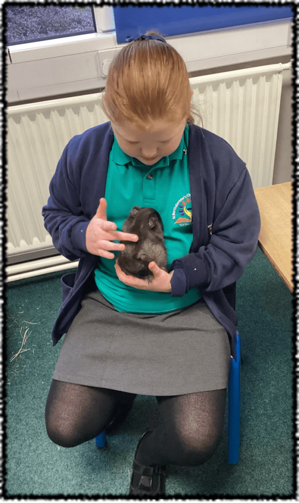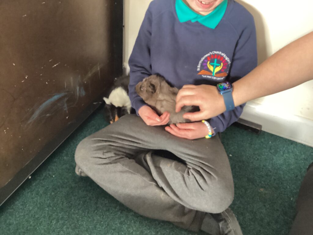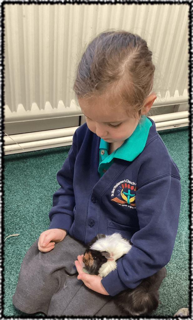 This term we have introduced two new friends to our St Bartholomew’s family; Hazel and Olive. The children love to visit the Guinea pigs and help to look after them. We change their water, top up their food and straw and have cuddles every day. The Guinea pigs are great therapy animals and have been a great help for any children who may sometimes need a bit of space to think and unwind.