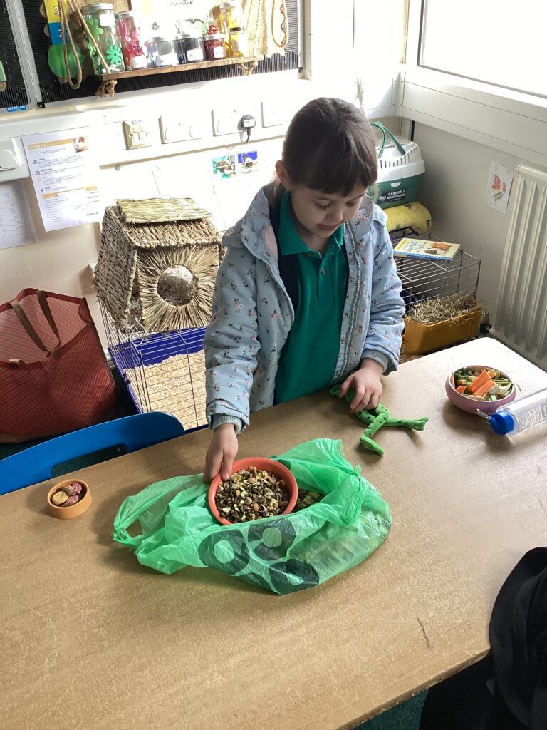 Once everyone had had a chance to hold or stroke them, and their cage was sparkling, we explored what they need in their cage and why each part is important for them. We put in new bedding, straw, cardboard to chew on and filled their food and snack bowls.